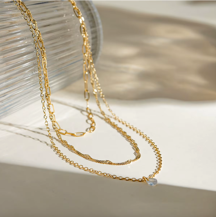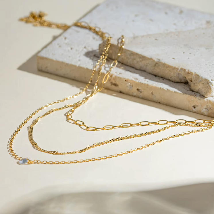 Elevate your style instantly with this effortlessly chic layered gold necklace set, a versatile jewellery box staple designed for modern wear. This convenient three-strand set combines three distinct chain styles for a complete, curated look: a chunky paperclip, oval link chain, and a delicate fine chain with subtle charm at the center.